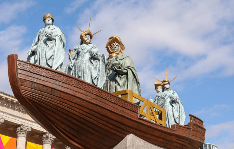 During Britain’s colonial expansion, statues were not only placed in Britain to commemorate officers and ‘heroes’ for the public to look up to, statues of important figures were also shipped to colonies. Most notably, statues of Queen Victoria ‘were shipped around the world as a representation of empire’ (Ikon Gallery, 2022). In Guyana a statue of Queen Victoria was commissioned in 1894 to mark the monarch’s golden jubilee. The statue resided in front of Georgetown’s law courts, however, after Guyana became independent from British rule, the statue was beheaded, and the remains were thrown into bushes of the botanical gardens (Drayton, 2019, p. 14). Artist Hew Locke recalls passing the statue while growing up in Guyana and was shocked that the statue was vandalised, prompting him to question ‘what public statues are for’ and ‘how come we pass by them without noticing every day?’ (Stuart, 2022) in his temporary public sculpture Foreign exchange. The art piece was commissioned for the 2022 Birmingham Commonwealth Games and was created to encompass the Queen Victoria sculpture in Victoria Square, Birmingham. Most notably there are five additional Queen Victoria sculptures added to the original that are all encompassed within a large wooden boat – visually referencing the shipping of Queen Victoria statues to the colonies (Commonwealth sport, n.d.). Over time the statues within these countries have become a symbol of the Crown’s complicity in the ‘history of violence, attempted genocide, and theft’ (Hatt, 2022, p. 2). Locke’s installation reimagines and encourages the public to view the statue through a post-colonial lens – where instead of a memorialisation or celebration there is reflection and an uncovering of the past.
