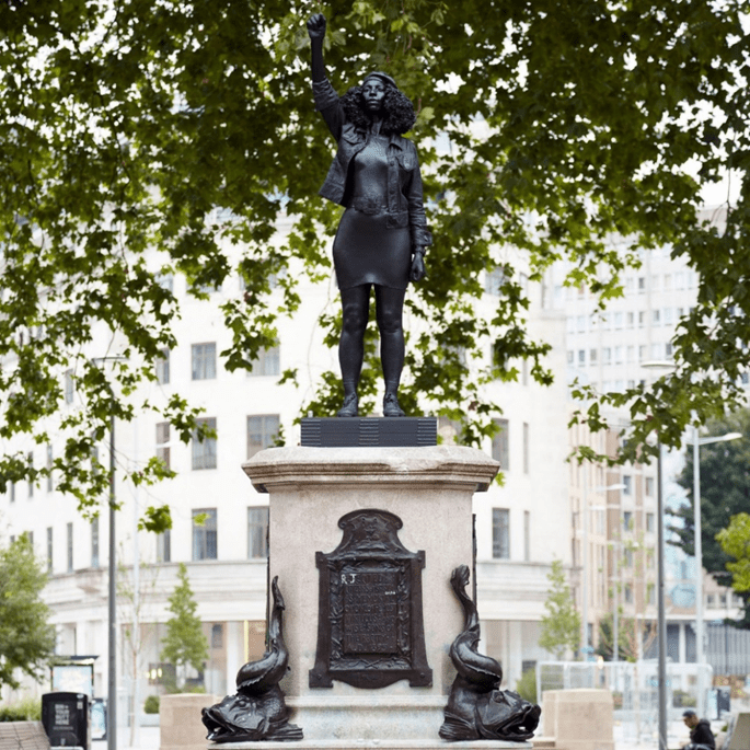 In 2020, George Floyd’s murder catalysed waves of global Black Lives Matter protests. In Bristol, years of campaigning for the removal of the Edward Colston statue ended in a historic moment where the statue was defaced and toppled by protestors. This ‘act of history’ (Woods, 2020, p. 18) heavily influenced the discourse on the decolonisation of statues and monuments in Britain, changing public perception on the purpose of statues and led people to question problematic statues that still stand. Immediately after the statue was toppled the ‘empty plinth once occupied by the slave trader’ Edward Colston (Price, 2021) held a new statue named A Surge of Power by Marc Quinn featuring a black resin sculpture of Jen Reid, a Black lives matter protester who climbed the empty plinth during the George Floyd protests in June 2020. At first the artwork was praised, and Quinn was applauded for using his White privilege to ‘keep the conversation going’ around Black Lives Matter (Wall, 2020). However, many people of colour viewed Quinn’s sculpture as the opposite of allyship, and more as an act of ‘White saviourism…rolled into one sculpted lump of black resin’ (Morris, 2020).