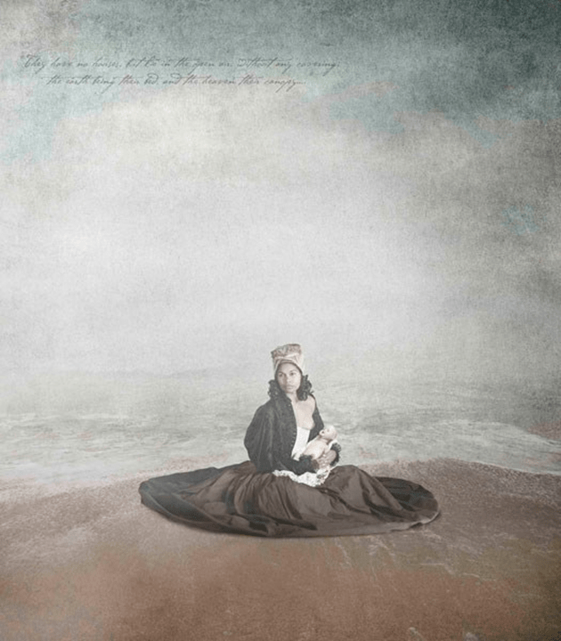 More so, the colour and lighting, in Civilised #12, produces an eeriness through the unsaturated, dull tones of the beach landscape, creating a ghostly feel to the image as the sea fades into white hinting to a lack of life. Further to this, the faded background camouflages the written words of William Dampier, in the top left corner, where he recalls his interaction with Aboriginal people stating, ‘they have no houses but lie in the open air, without any covering; the earth being their bed, and the heaven their canopy’. Cook’s choice to embed an explorers perspective into the photograph is a reminder that these words are part of history and should not be forgotten. It acknowledges a European perspective that heavily influenced and changed the lives of Indigenous people forever – this is reinforced through the handwritten font that illustrate Dampier’s words. The handwriting implies subjectivity as rather than it being presented as a passive voice it holds a sense of responsibility and accountability. The words dissolve into the bleak seascape allowing audiences to focus on the Aboriginal figure and her story that represents many.