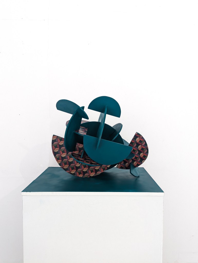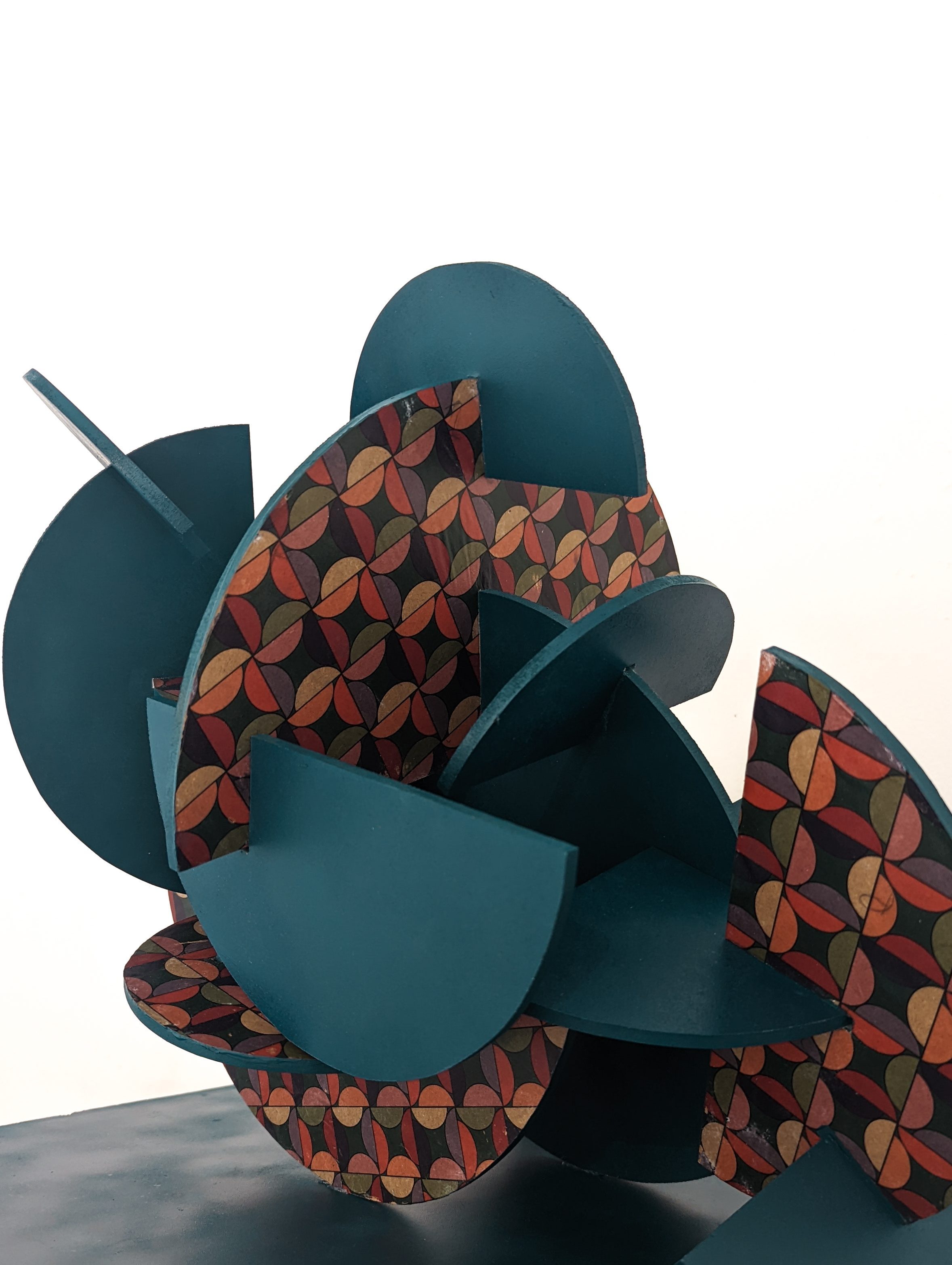 6 of one, half dozen of the other emphasises the struggles mix raced individuals face as well as portraying my own heritage and the strong connection I have with my South Asian roots. The sculpture is composed of multiple MDF semi-circles that fit together to create an abstract sculpture. The presence of semi-circles is a common feature within my work as the shape relates to the idea of two halves/races coming together to create a whole. This semi-circle theme is continued in the vibrant pattern depicted on areas of the sculpture, this pattern is inspired by Ralli Quilts (colourful and geometric quilts made in South-eastern Pakistan). I wanted to incorporate not only the visual geometry but also the meaning behind the quilts as the name Ralli is derived from the local word ‘ralanna’ meaning to mix or connect which describes the sculpture well. A unique feature of 6 of one, half dozen of the other is the unbalanced design within the patterned areas and in the physical design of the sculpture. For example, when the audience is close to the piece, they can see that the semi-circles within the design do not perfectly fit into each other making the whole pattern off kilter. Moreover, the whole structure leans to one side illustrating imbalance. These specific design choices illustrate a metaphorical rift that evokes an unplaceable connotation which many mixed raced individuals identify with.