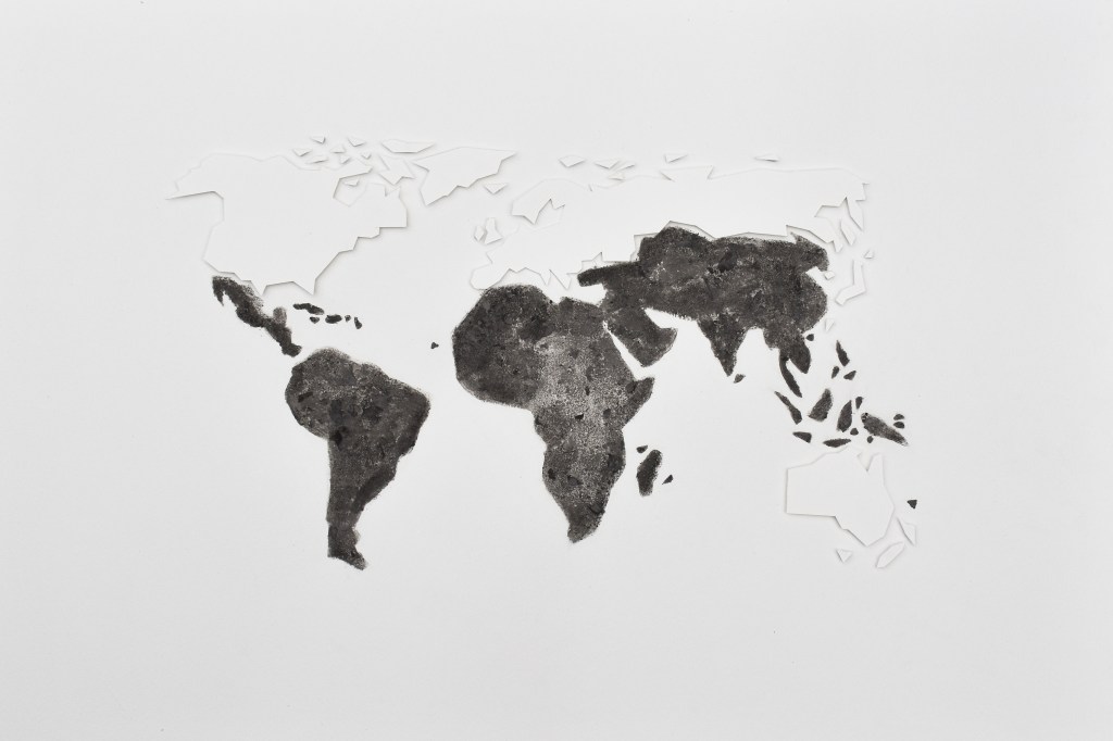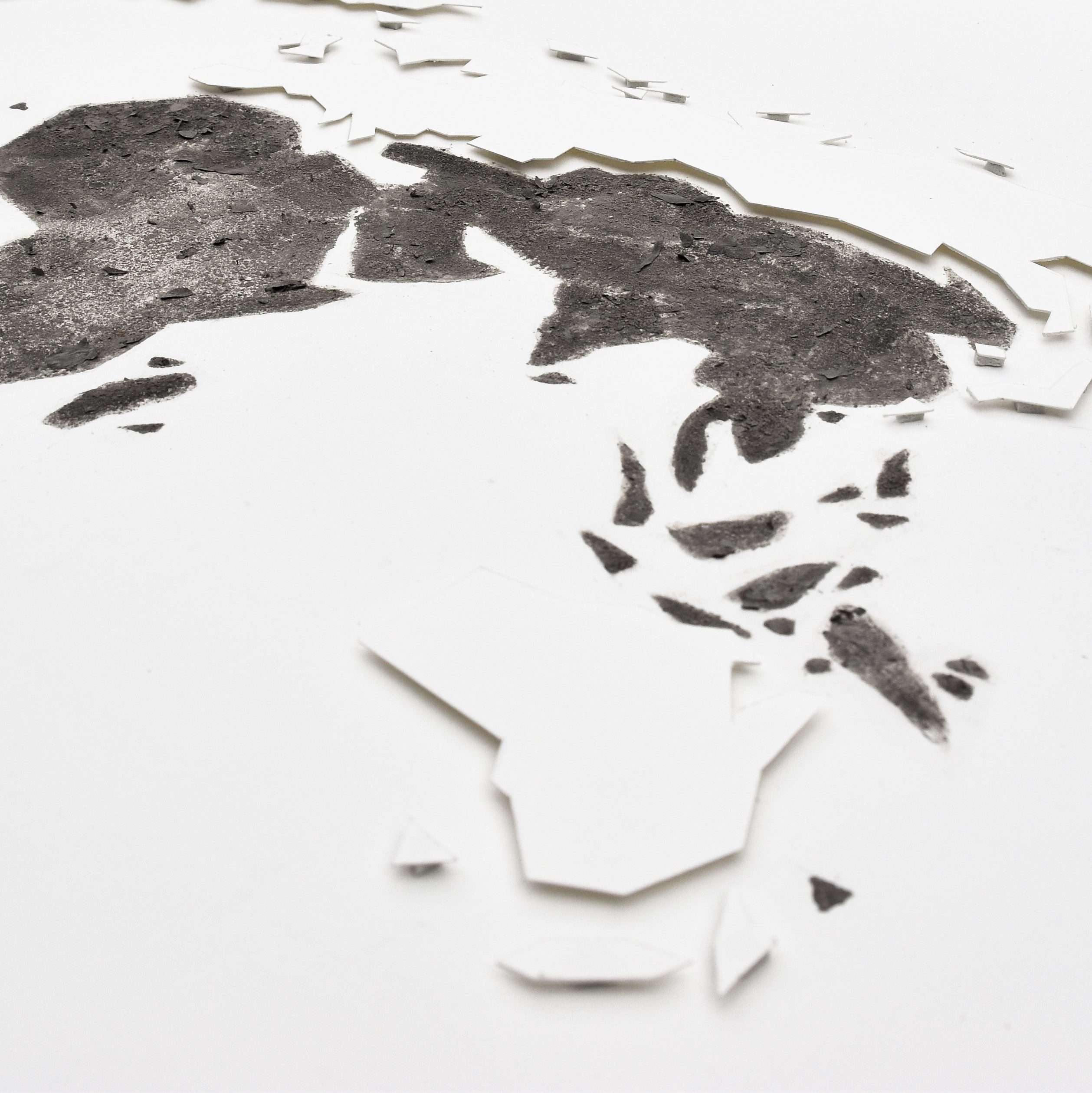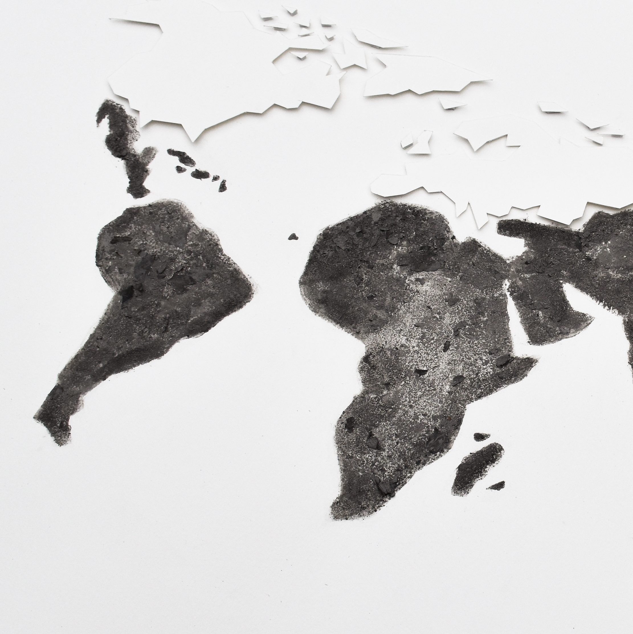 Ashes to ashes portrays the divide between the Global North and Global South, in particular the devastating impact of climate change on the global south. The map of the Global South has been constructed using layers of paper ashes the dark colour and texture contrasts the smooth white paper used for the map of the Global North.