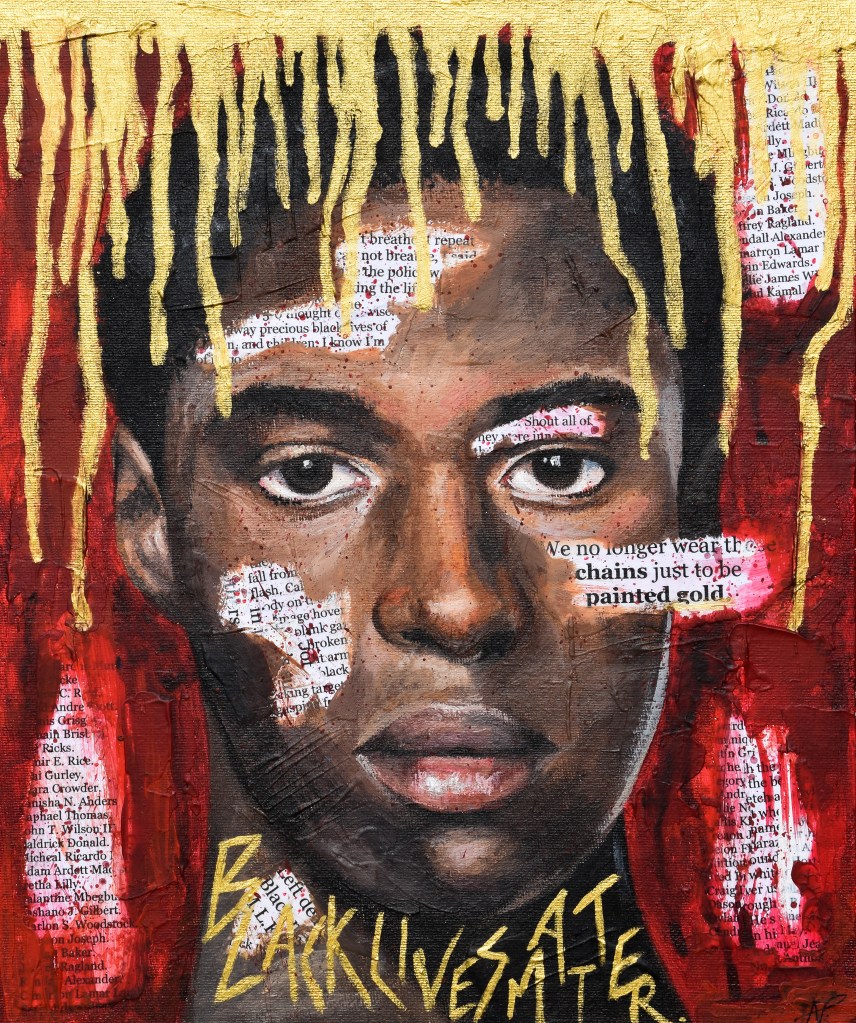 In times when I am left speechless, I find my voice through art. For about 3 months now I haven’t had the motivation to create any art, every day I would remind myself to do a sketch or a watercolour piece but I found myself mentally and physically restricted. This whole movement has been the push I needed, as I’ve been able to apply my creativity for something I am truly passionate about – Social Justice. If what you have seen over the past few days has shocked you, it shouldn’t. Acts of blatant racism and police brutality against black people (and other ethnic minorities) is not new. Like Will Smith said ‘racism isn’t getting worse, it’s getting filmed’ and now non-black people have a duty to stand up and use their power to speak out against forms of institutionalised racism. I hope that those who have posted for the #blacklivesmatter movement continue to fight even when the media coverage dissipates because this isn’t a trend, it’s real life and it’s happening daily to millions going unreported. I have created this piece of art inspired by recent events. The pieces of literature seen covering parts of the face are inserts from powerful poems that are inspired by the Black Lives Matter movement. The line ‘We no longer wear those chains just to be painted gold’ from the poem ‘Dear Emmett Till’ holds heavy connotations. The reference to chains is symbolic of those worn by black slaves, a symbol of racism, sadly concealed today with a gold veneer inferring that everything is ‘perfect’. In a similar vein, the dripping gold partly conceals a background of blood-red; a reference to the fact that the killing of innocent black people is covered up and ignored.