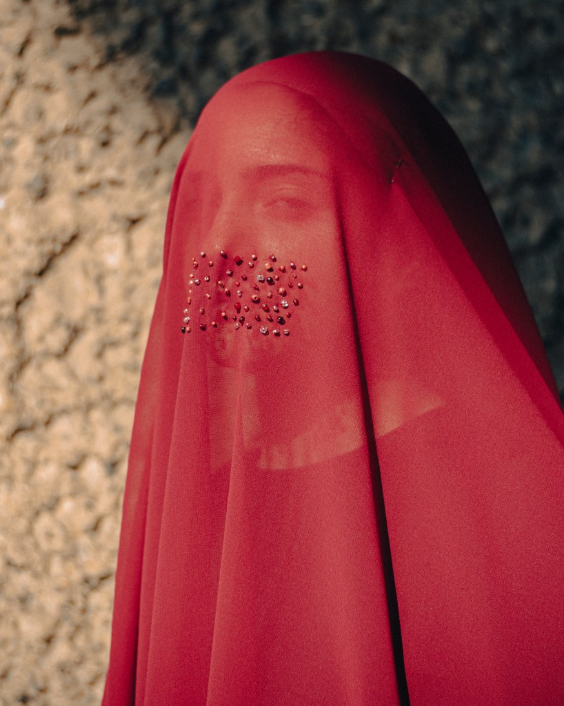 I am the context, 2024, voile, beads, thread, photography by Mehaira Abdelhamid