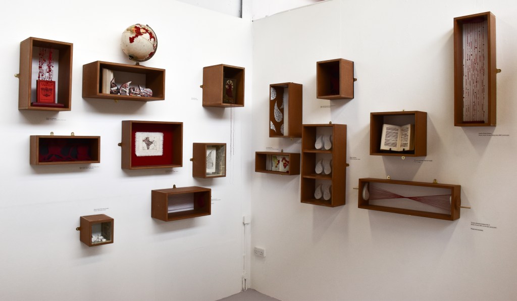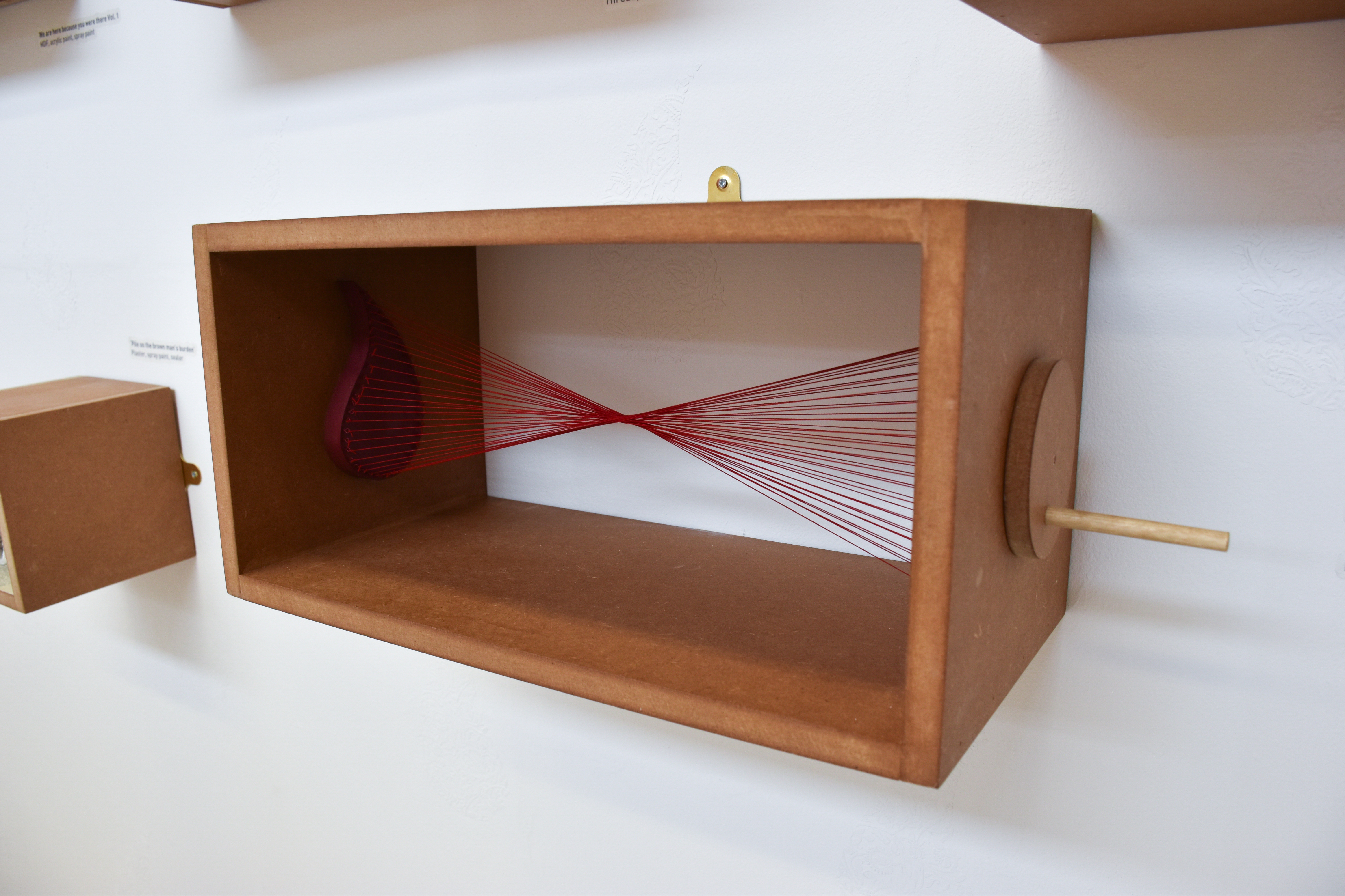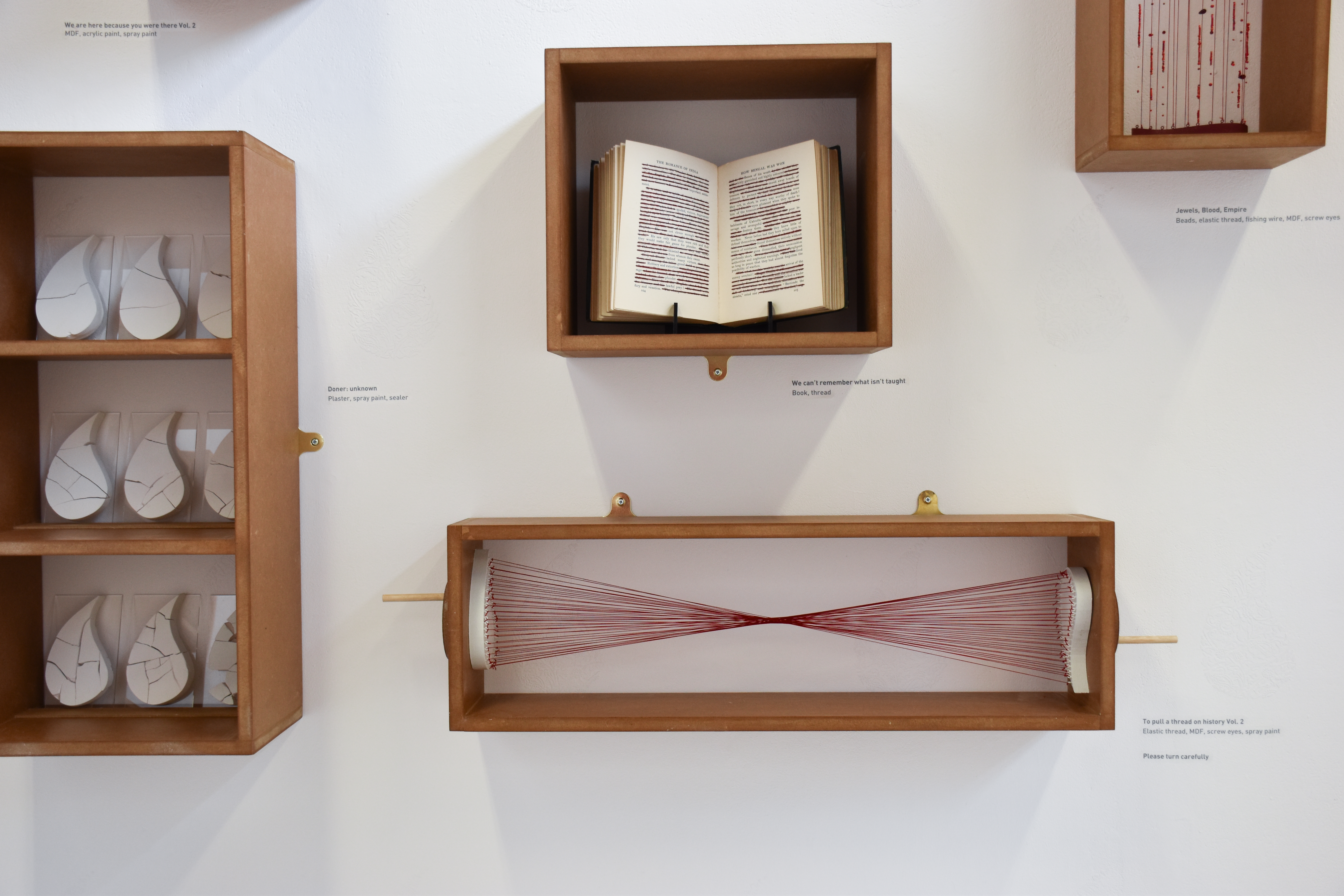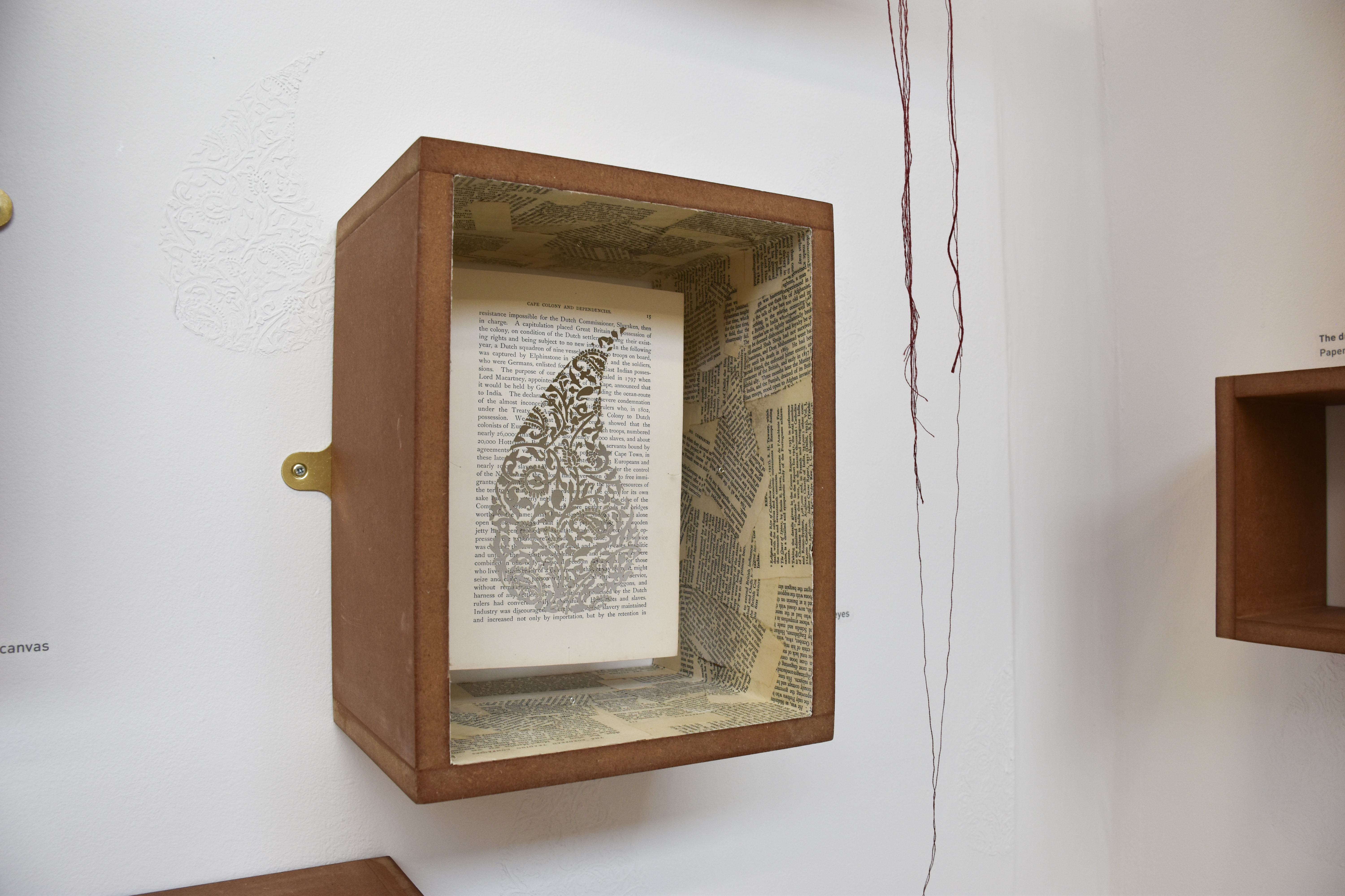 Although museums are no longer overtly used to promote Britain’s colonial conquests, the same power structures are embedded in displays and descriptions of artefacts. Room 84 re-imagines the Western Museum by revealing the darker side to colonial history – a side of history missing from museums – this is seen through the gallery wall box displays that the audience can interact with and touch for example, To pull a thread on history vol.1 & vol.2 incorporates manually turning Paisleys.