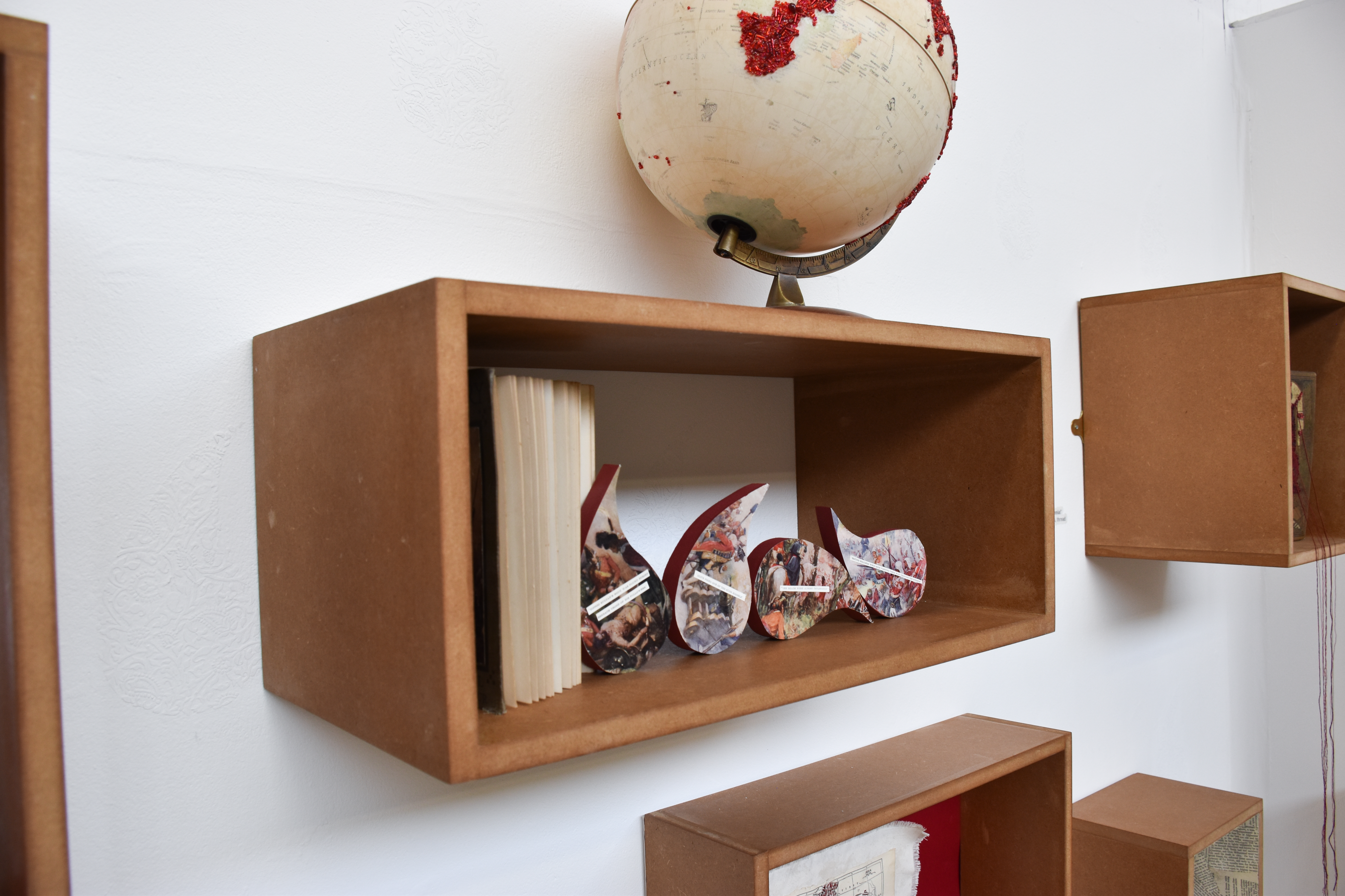 MDF, plaster, thread, elastic, paper, books, beads, globe