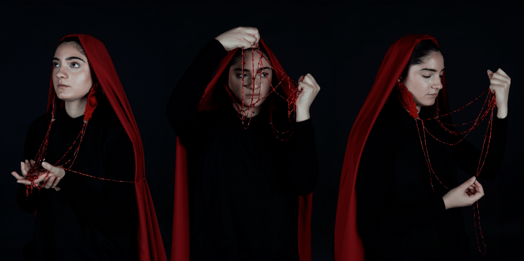 Dual heritage and Britain’s colonial past are brought together in You’re not sari showcasing laser cut earrings comprised of clear and distinct shapes in an untraditional response to South Asian adornment. The decision to incorporate jewellery into the project was inspired by Jewellery designer Anisha Parmar whose project ‘empowered adornment’ investigates cultural jewellery as a ‘tool of empowerment…and a form of body armour’ (Parmar, 2021). The power/symbolism of culture attached to South Asian Jewellery guided the theory behind You’re not sari as the piece aims to demonstrate the history of colonialism in South Asia. The red beads symbolise the riches stolen and the brutality of colonialism as the beads echo the appearance of blood. The earrings are inspired by my mixed raced heritage (white Italian and Pakistani). The tethering of the earrings together by the red beads, not only creates a physical weight but also links to the heavy history attached to South Asian heritage.